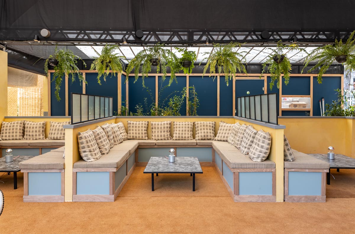 Imagine um cantinho como esse no fundo do quintal para reunir os amigos, comer um fondue ou tomar um chá da tarde… Embora esse seja um ambiente comercial, a ideia serve perfeitamente para terraços em casas de campo. Aqui, o banco foi feito de madeira, mas poderia ser de alvenaria também. Em sua tonalidade mais leve, o amarelo aceitou o azul suave como companheiro. Apesar de serem dois tons primários, na paleta pastel, eles não formaram uma combinação infantil.