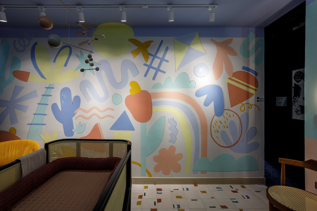 Cores: Branco Natural, na parede, e Rosa Laço, Paços de Dança, Desejos do Coração, Cacto Dália, Azul Velejador, Azul Porcelana, Fada Azul e Céu de Domingo, no mural
