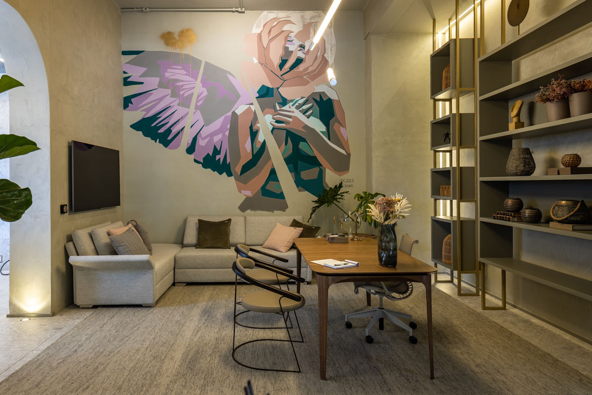 Dizem que encomendar um mural artístico só tem uma questão: você vai gostar tanto que vai querer fazer vários em diferentes ambientes - quartos, banheiros, corredores e até garagens! Mesmo antes de o muralismo virar uma tendência, o arquiteto desse espaço já os usava em seus projetos de CASACOR. Repare que o anjo estilizado desenhado por @casulo foi concebido com tons neutros e suaves para manter a sobriedade do escritório. Ele tem também formas geométricas para deixá-lo mais adulto e instigante. Ou seja, o mural é um elemento importante e deve casar com o estilo da decoração.