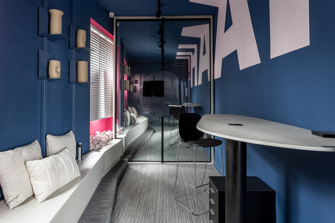Os enxutos 14m2 não desencorajam o arquiteto a usar cor intensa. Pelo contrário! É justamente o azul forte que traz personalidade para a sala em formato de corredor. Ao entrar aqui, a sensação é de surpresa. vem daí o o AH! estampado na parede. Refletido no espelho ao fundo, ele se prolonga. Repare bem que as letras foram pintadas com um rosa bastante leve que cria suave harmonia com o rosa mais intenso das janelas. Se você também tem vontade de usar tons contrastantes nos batentes dos caixilhos pode fazer uma simulação de cores no Coral Visualizer (para Android e IOS) Nele, você faz o upload de foto da sua casa e simula a pintura para ver como as tonalidades se comportam juntas.