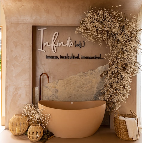 Todos os anos, a mostra CASACOR define um tema que os arquitetos e designers de interiores devem seguir. Em 2022, o tema era Infinito Particular. Daí o adjetivo escolhido pelas arquitetas para essa parede - num cantinho que sugere um banho com ares filosóficos. A palavra "Infinito" tem até retroiluminação que, quando acesa, ajuda a mostrar ainda mais o brilho perolado do Efeito Especial Velvet. Quer ter esse mesmo brilho em casa? Nas Páginas Coloridas há muitos pintores profissionais que sabem aplicá-lo Escolha o mais próximo de você pelo seu CEP.