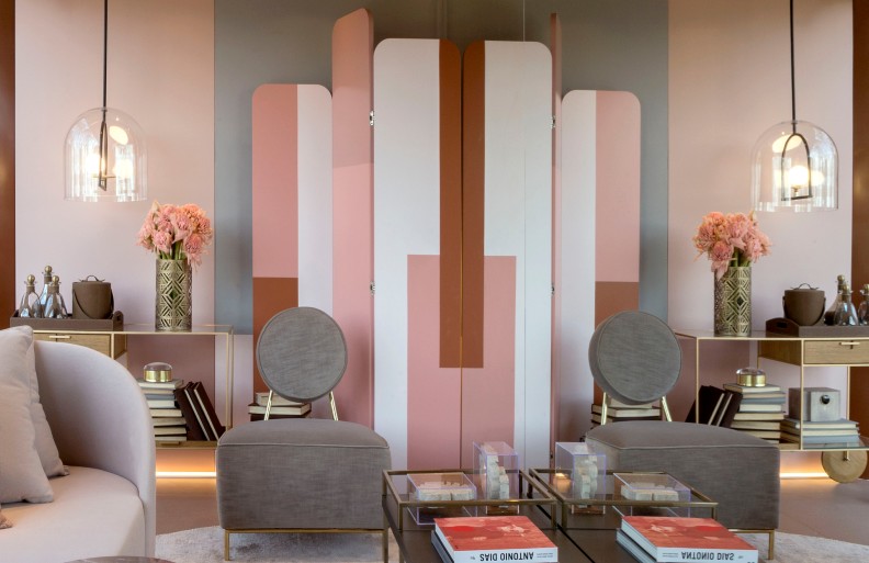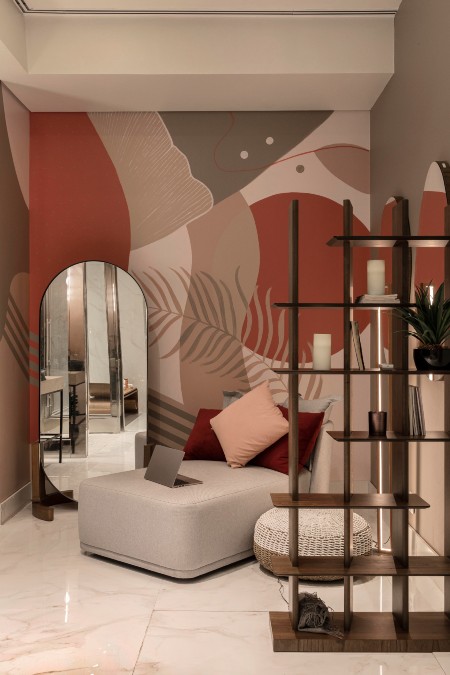 Cores: Pena Prateada, na parede e no forro, Bronze Tibetano, Esgrima, Pedra Esculpida e Ouro Monarca, no desenho geométrico da parede, Pedra Esculpida, Pote de Argila, Floresta do Congo, Folha de Louro e Ocre Profundo, no desenho floral