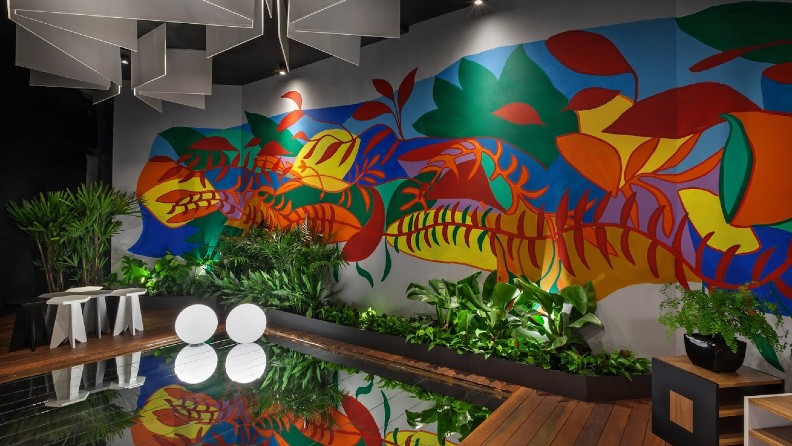 A primeira escolha, nesta sala de banho, foi a paleta. As arquitetas observaram as sugestões da Coral e chegaram a um conjunto de cores expressivas, ligadas ao conceito de Autoconfiança, do estudo Colour Futures 2021. Só então convidaram as artistas do estúdio Lúdico Arte para imaginar um conjunto de flores e ramos - eles deveriam ser delicados, mas intensos, como o nome da paleta sugeria. Esse é um bom percurso a ser seguido por quem deseja desenhos nas paredes de seus ambientes. Delimite também o espaço que os artistas deverão ocupar com a arte. É possível salientar com eles elementos da arquitetura, como vigas e pilares.