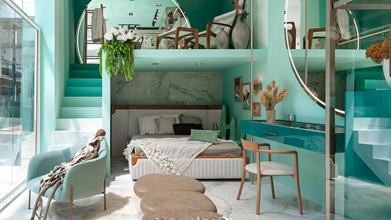 Cores: Verde Radiante, Água com Limão, Amanhecer com Neblina, Espuma Cítrica, Aquário Verde e Pedra Italiana, nas faixas em degradê da parede e do teto.