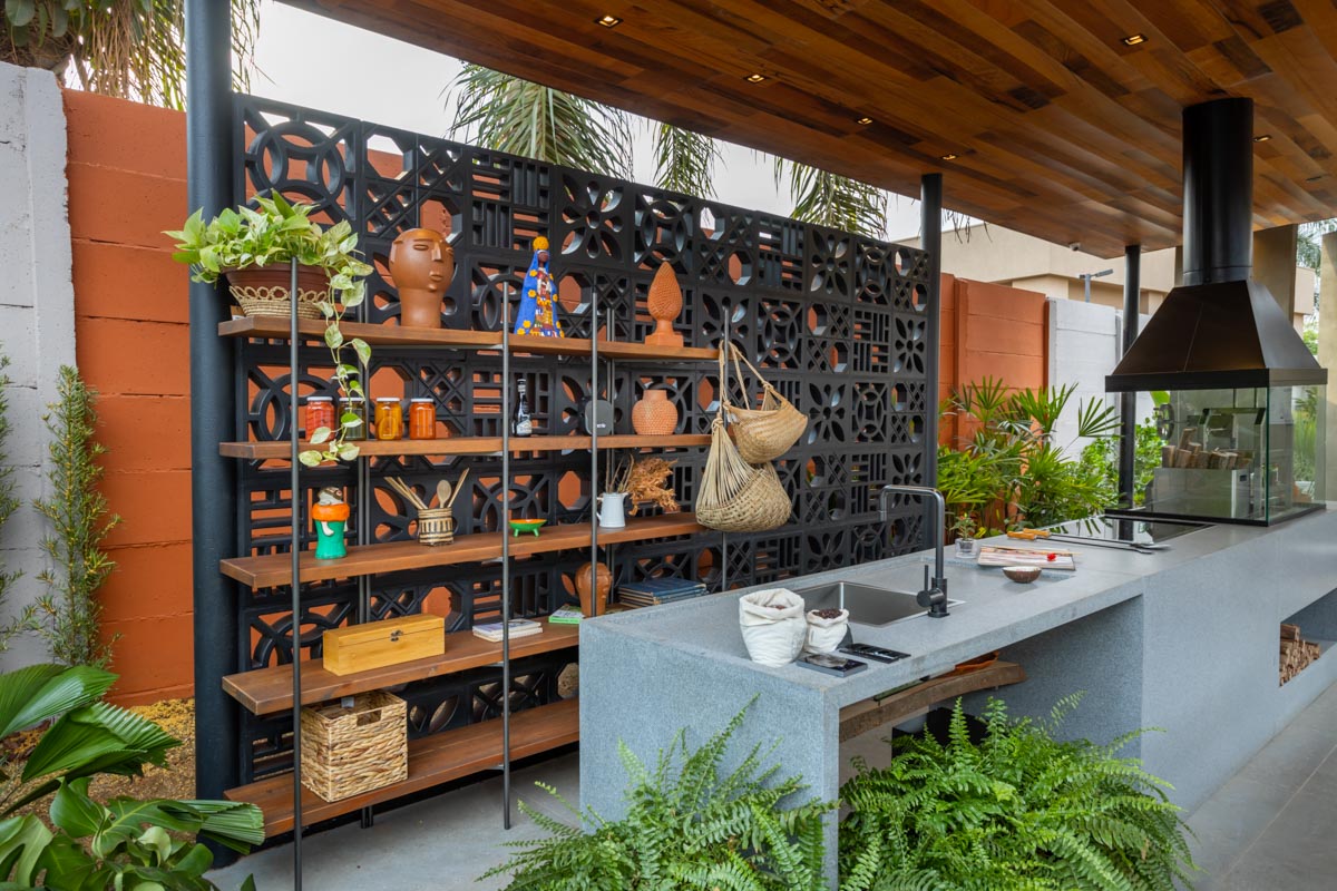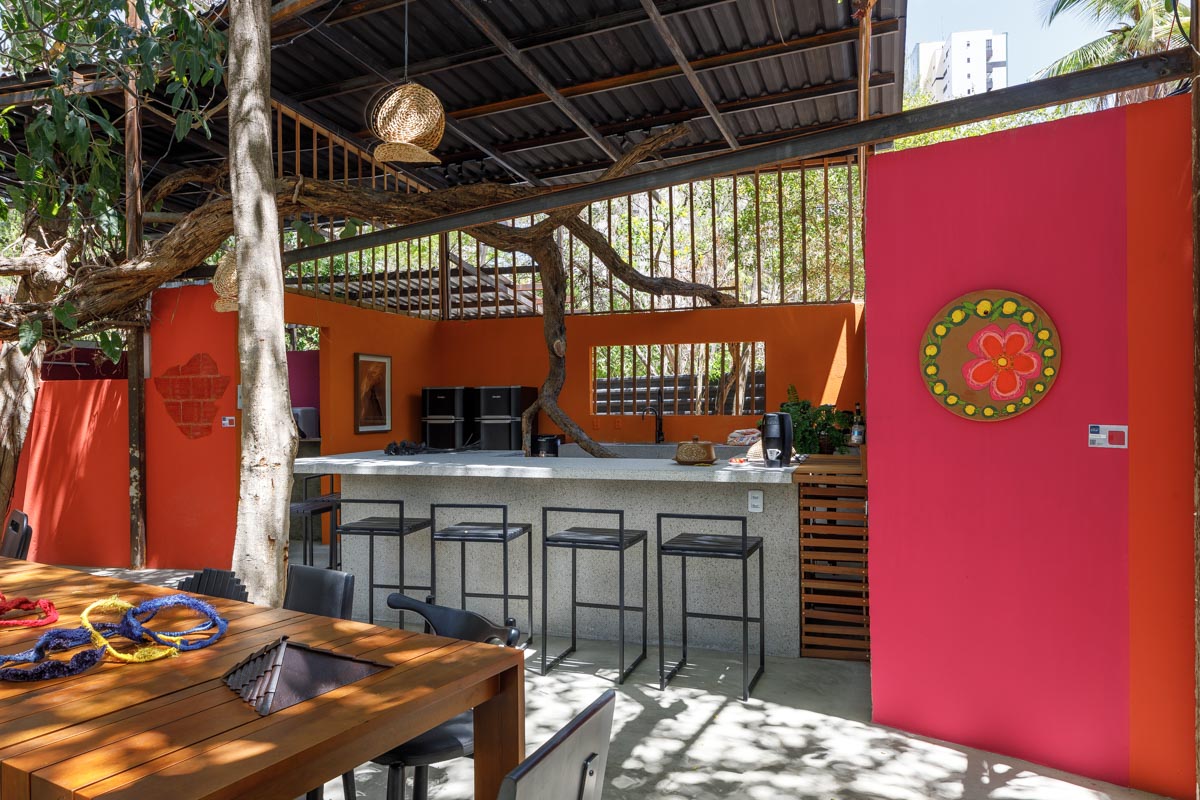 Quem tem a chance de fazer sua varanda gourmet sob as árvores, cria um clima mais descontraído. As cores ajudam nesse processo. Aqui, o balcão central em pedra é bem neutro, mas as paredes foram coloridas com tons bastante vibrantes. Caso sinta insegurança ao escolher as cores, que tal uma simulação virtual no Coral Visualizer (para Android e IOS)? Basta fazer o upload de uma foto do seu espaço e ir trocando os tons até achar a melhor combinação.